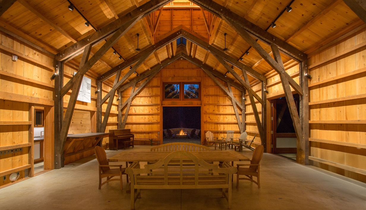 Inside, exposed scissor trusses and raw structural elements conjure the reverent atmosphere of a cathedral. Sunlight filters through a ridge skylight and cupola, illuminating a tactile palette of reclaimed fir and redwood.