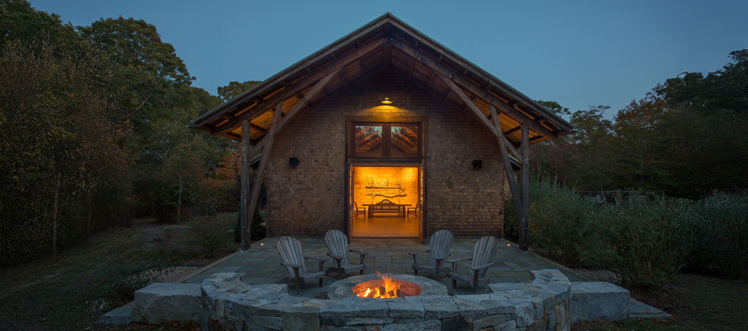 A built-in bar and integrated restrooms provide comfort and flexibility, and oversized redwood doors spill out onto bluestone patios framed by extended roofs, an orchard, and gardens.