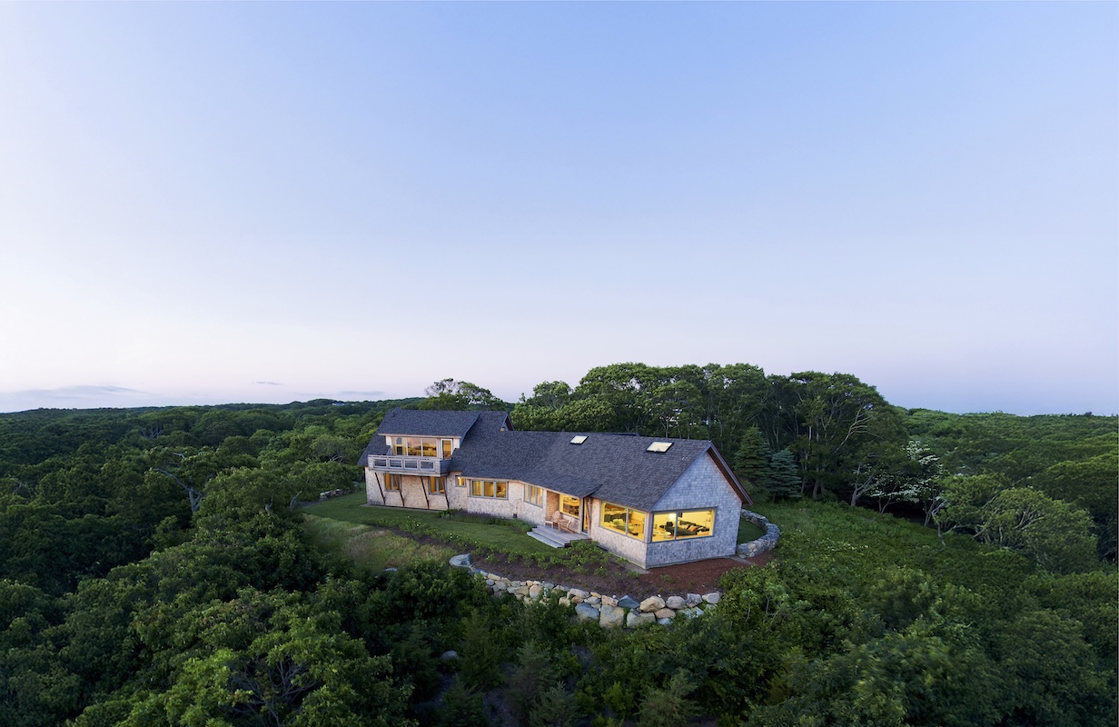 Outside, a broad, level meadow extends, ready for the annual family wiffleball game. A favorite feature is the custom outdoor shower, elevated on a rocky knoll, with views of the Elizabeth Islands and surrounded by native plants.